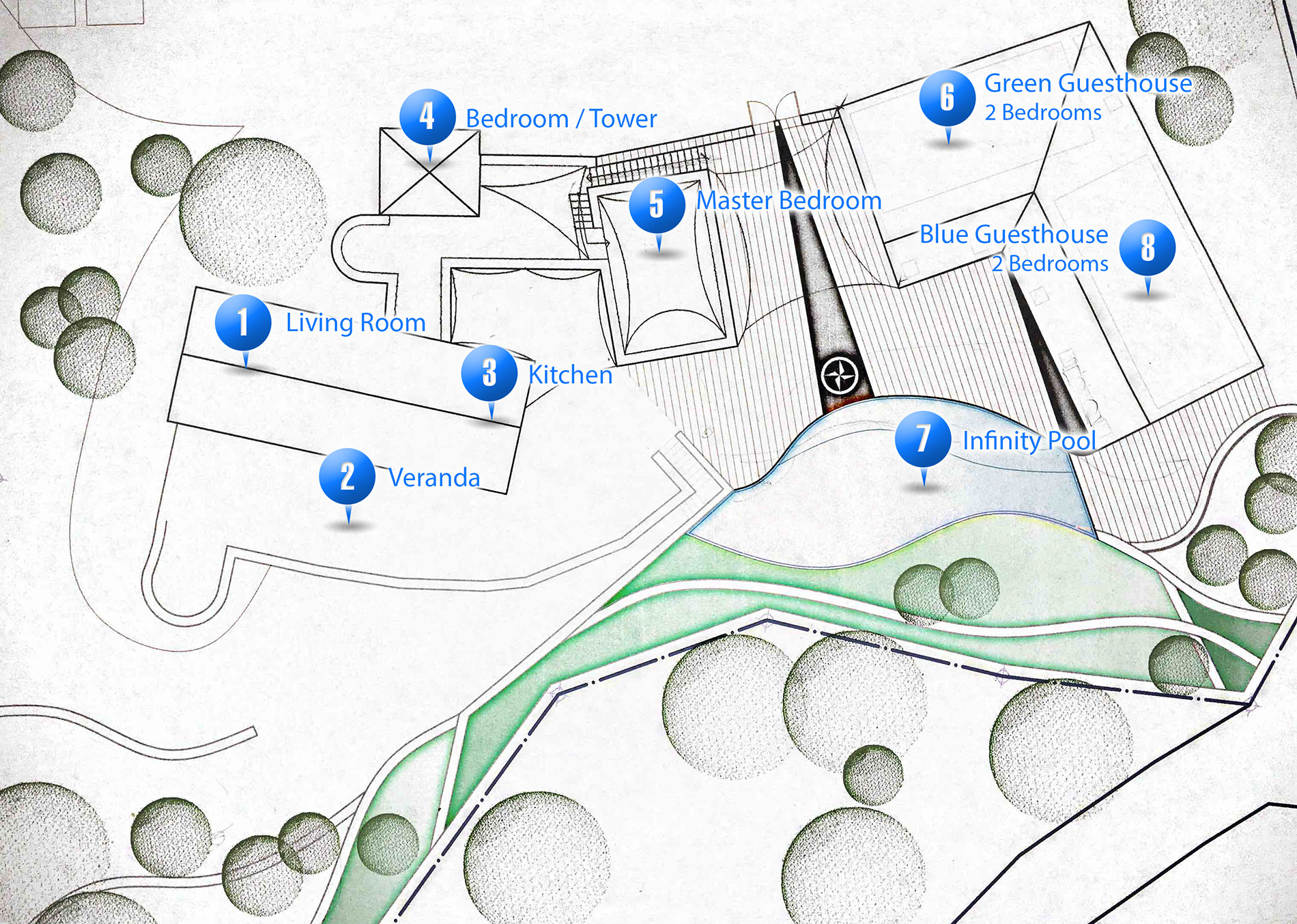 The private villa consists of the Main House, including large Verandas, inner protected Veranda, Living Room, Dining Room, Kitchen, a Master Bedroom with en suite bathroom and reading corner, and the Tower (sleeping up to three persons) with en suite bathroom. There is also a Hammam, personal training equipment, a Playroom in the basement, and parking space for up to six cars.